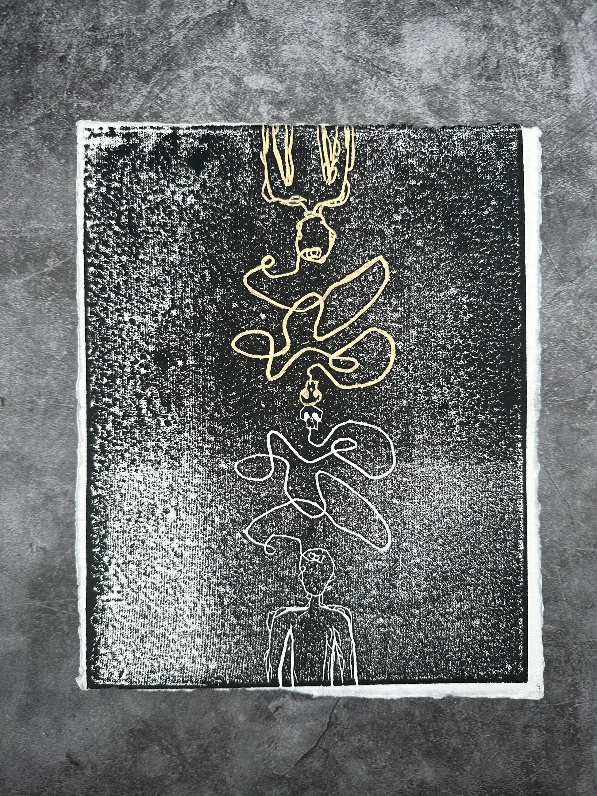 - 8x10” Block print on cotton paper, hand-colored gold pen